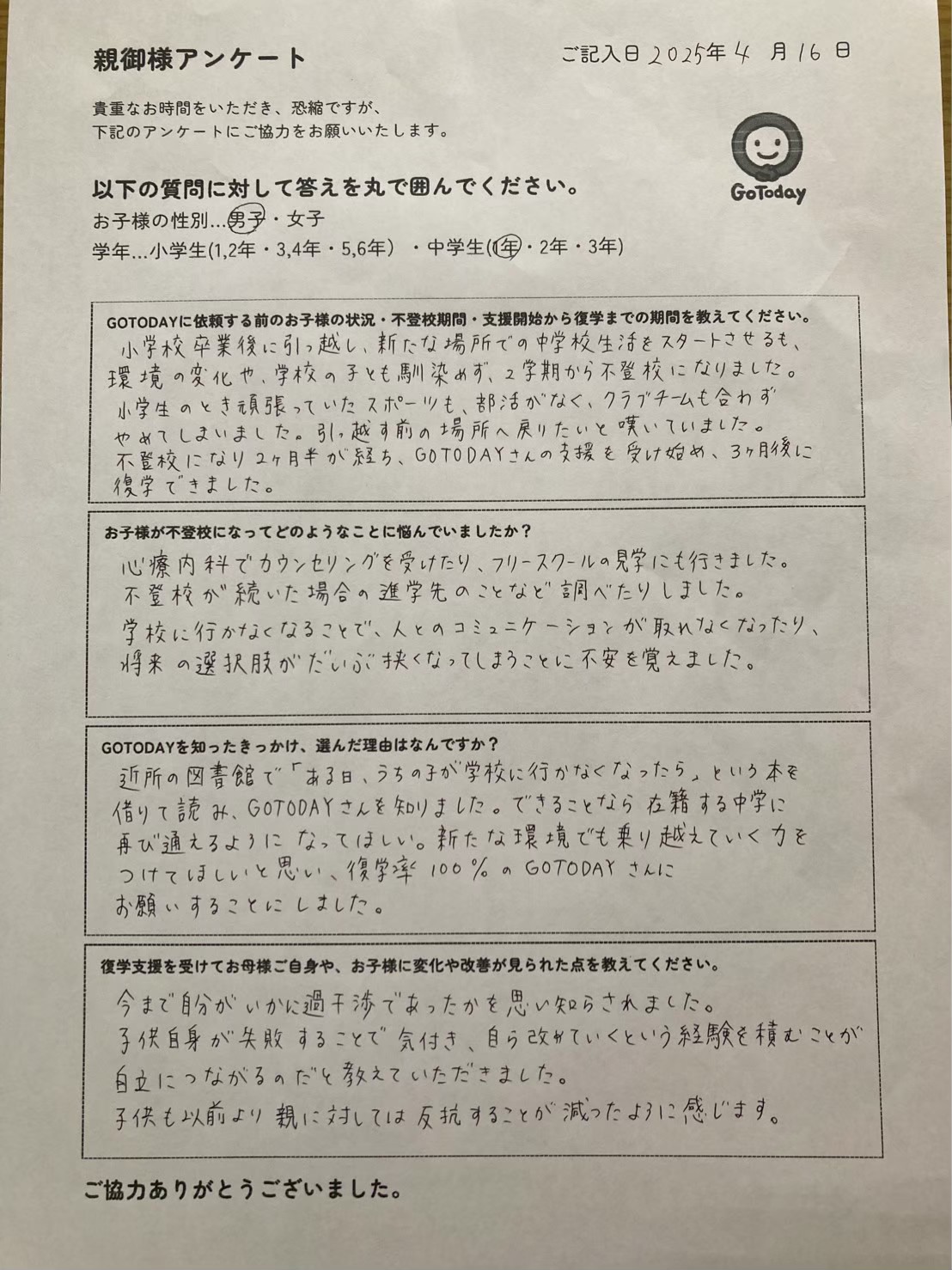 不登校になり2ヶ月半が経ち、GOTODAYさんの支援を受け始め、3ヶ月後に復学できました。